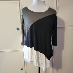Black, olive, white colorblock. Asymmetrical hem. Soft material with plenty of stretch.