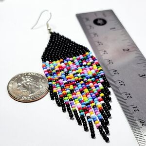 Handmade Seed Bead Fringe Earrings "Pixelated Rainbow in black"