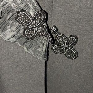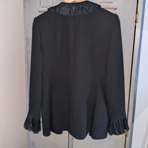 Elegant black blazer with ruffled trim. Perfect for formal occasions.