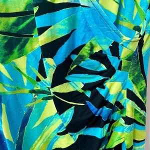Vibrant green, aqua blue & black Cache’ dress. Tropical looking. Like new, worn twice.