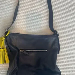 Details: Stylish Coach leather bag in navy blue. Features bright yellow tassel accents. Perfect for any occasion.