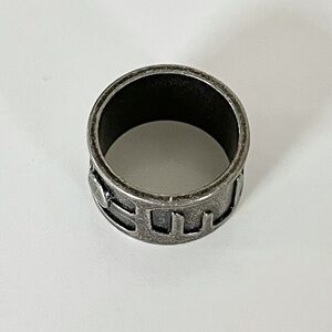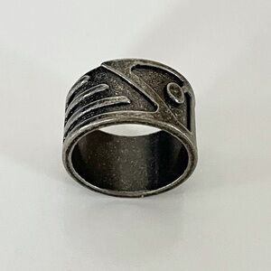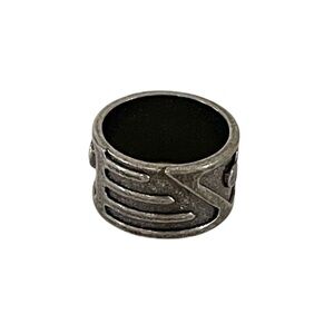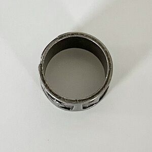 Stylish Gray Metal Ring with Accents. Seems to be metal material. Brand unknown. Light in weight. Hard metal, does not adjust. Metal gray color. Soft grainy feel on interior. Seems to be around size 7.5-8, according to chart below- but may vary since all charts are different. About 2.5” inches circumference with measuring tape. Please use your judgement. Pre-owned with some wear and some scratches, otherwise in good condition. See all photos.