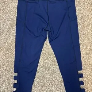 Stylish blue leggings. Features unique side details. Perfect for casual wear.
