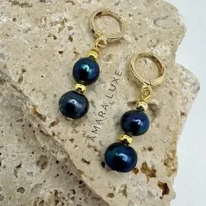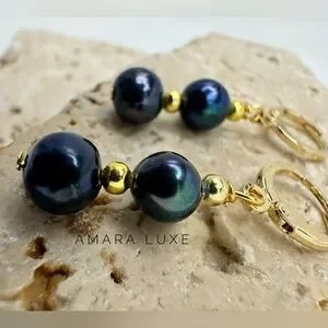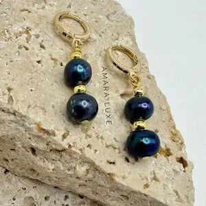 Beautiful quality natural 7-7.5mm black freshwater baroque pearl beaded dangle earrings with yellow gold plated lever-back. Drop measures approx 0.8”.