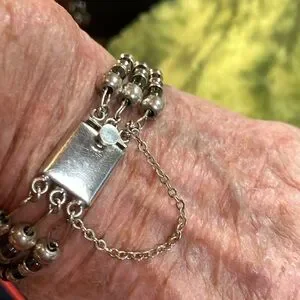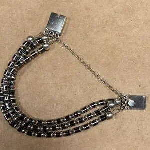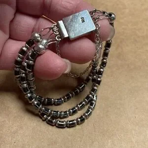 Previously owned beautiful 3 stranded hematite and sterling bracelet. It has a box closure with safety chain. Great to excellent vintage condition. A great addition to your sterling silver jewelry collection. Thank you for looking!