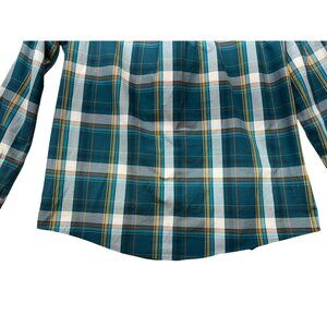 This Eddie Bauer shirt features a stylish teal plaid pattern suitable for various settings. Designed for a classic fit, it ensures comfort and style. The button-down design adds a touch of formality, making it ideal for work or casual occasions.