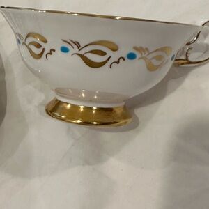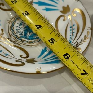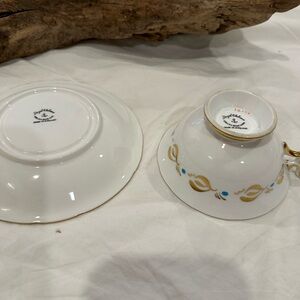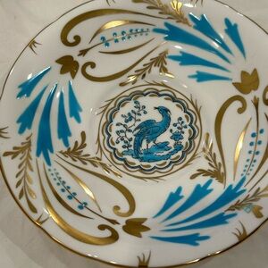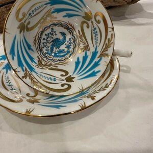 Royal Chelsea Hand Painted Gold & Blue Bone China Bird Tea Cup & Saucer features raised hand painted design in turquoise and gold