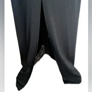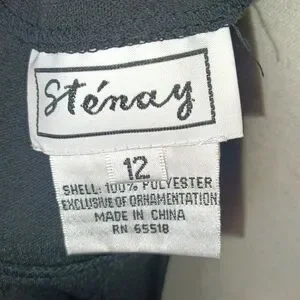 Stunning vintage black evening gown by Ste'nay is in excellent condition. Beaded and sparkling at the neckline, sleeve, and bodice. Sexy sheer fabric covers the chest and back. Beaded cap sleeve. There is a slit at the back. Back zip closure. Fabric drapes beautifully. 100% polyester. Size 12.
