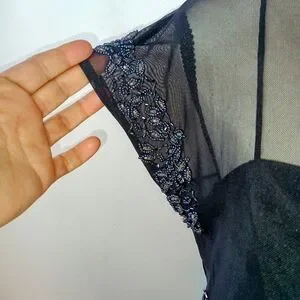 17" armpit to armpit. Sheer fabric has stretch to it.