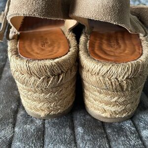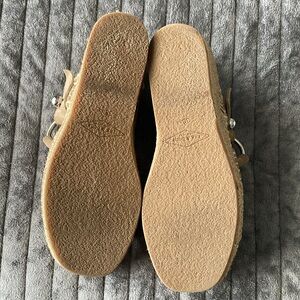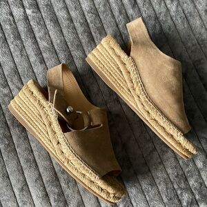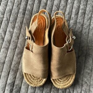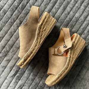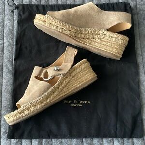 Step out in style with these chic Rag & Bone espadrille wedge sandals. Perfect for any casual outing, these sand colored soft suede sandals feature a silver O-ring slingback closure, braided jute wedge platform, leather insole and rubber outsole. Made in Spain. Size 38.5 which runs as 8.5 with this brand. Excellent condition and dust bag included.