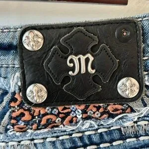 In good preowned condition with 1 flaw- a single missing embellishment on the back leather patch- top right corner. See photos. Otherwise all gems are in tact