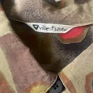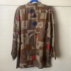 Vintage funky blouse with a unique geometric pattern. Features a button-up front and long sleeves. Perfect for a bold fashion statement. Feels like a rayon silk blend. No stains, holes, etc!