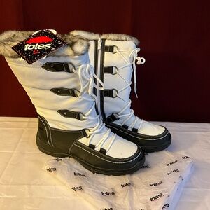 Stylish Totes winter boots. Features white and black design. Fur trim adds warmth. Boots are brand new. One has a small blemish as shown in one of the pictures.