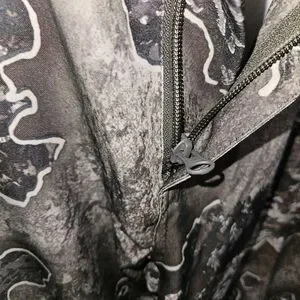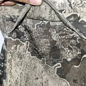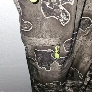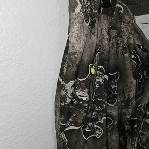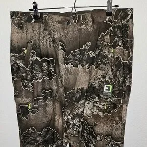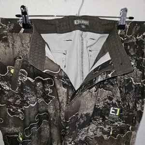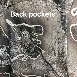 Multicolors, camo in colors. Front zip up with button, belt loops. Four zip-up pockets and two back pockets.