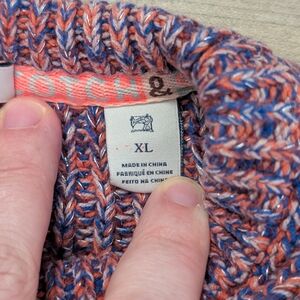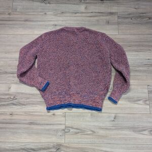 Stylish knit sweater. Features a blend of red and blue tones. Perfect for casual wear.