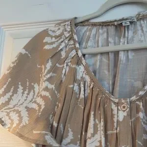 This tunic showcases a beautiful tan and white color palette with a relaxed fit that drapes elegantly. The puff sleeves add a charming volume, while the ruffled details enhance its stylish appeal, making it a perfect choice for casual occasions.