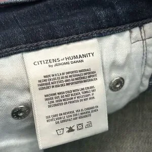 Citizens of Humanity dark wash Rocket Crop high rise jeans by Jerome Dahan. Size 31, waist band measures 16” across lying flat. Inseam is 24”, from the waist band to cuff is 35”. These have been worn a couple of times, with no visible holes, rips, or stains. Originally purchased from Neiman Marcus.