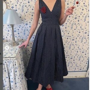 This stunning piece in navy with white polka dots is a wardrobe must-have! 🖤🤍 Crafted from luxurious cotton satin, it features a flattering v-neckline and a corset-inspired paneled bodice that beautifully accentuates your figure. The full, pleated A-line skirt adds a touch of elegance and movement, making it perfect for brunches 🥂, weddings 💐, garden parties 🌸, or a polished everyday look.