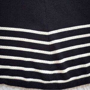 Fun and flirty, this black knit dress from Eliza J features sailor inspired white stripes across a square neckline, flattering princess seams that flow into a twirly skirt, with the same stripes at the hemline.