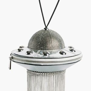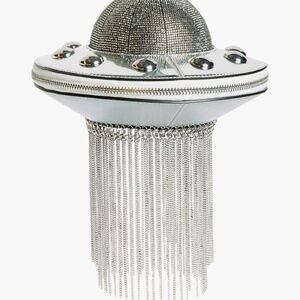 kate spade new york::Spaced Out Embellished Leather UFO Handbag. Take your ensemble to intergalactic dimensions with this sparkly wristlet bag shaped like a UFO glittering with studs, crystals and chainmail-style fringe.