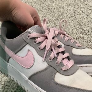 Stylish Nike Air sneakers. Features pink laces and gray accents. Comfortable and trendy. Custom Air Forces used size 9.5 women’s.
