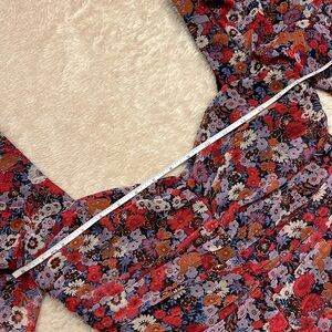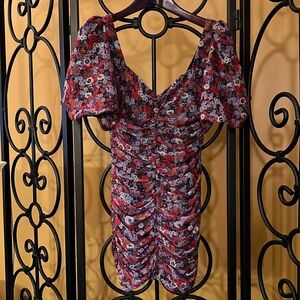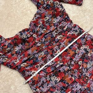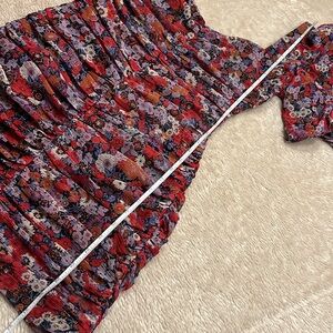 Beautiful femme style ruched mini dress with very subtle gold metallic threading running throughout dress. Puff sheer sleeves with single button closure that gathers with elastic at arms. Ruching of fabric down front and back of dress. Sweetheart neckline. Open low back. Zips at back (zipper works perfectly). Floral patterns in red, purple, green and gold metallic accents make this another Zara must have! It is a wonderful piece of wardrobe to add to your travels, it doesn’t wrinkle! 100% Polyester. Machine wash, cold/delicate cycle. Hang dry. Gift(s) included with purchase. Should you have any questions, please do not hesitate to ask. Thank you for visiting my closet. 💐