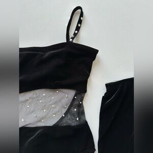 Style: Body suit with spaghetti straps, mesh cut out with rhinestones. An asymmetric velvet skirt with fringe.
