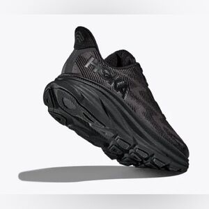 Keywords: Hoka One One, Clifton 9, women's running shoes, lightweight, breathable, HOKA cushioning, durable, rubber outsole, athletic shoes, black sneakers, lace-up, low top, gym shoes, casual wear.