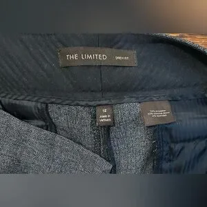 The Limited Drew fit black/grey dress pant. These pants have a wide leg, with side and back pockets. Little button design on the front and a flattering front closure. They are size 12 with the waist measuring 18” across lying flat and the inseam is 30.5”. These were originally purchased by me.