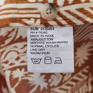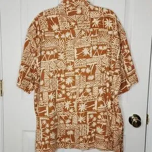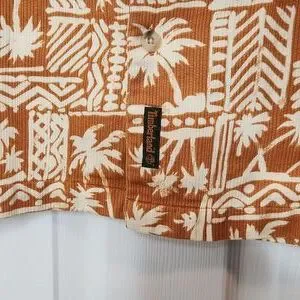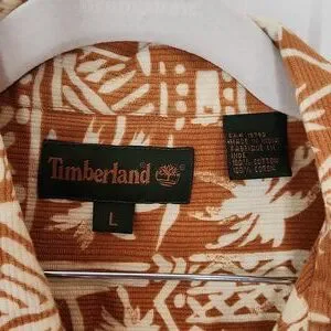 Men's Timberland Hawaiian print button up shirt in a light orange brown color, with a button breast pocket. Size large. Great used condition. 100% cotton, back of the neck hanging loop. Approximate measurements: 24" pit to pit, 21" shoulder to shoulder, 29.5" length, 4.75, 5.5" button breast pocket.