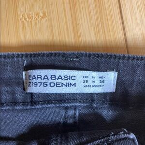 These black jean shorts feature a high-waisted design and a short inseam for a trendy look. The denim material is complemented by distressed areas at the hem, giving them a stylishly worn appearance. Waist is 13”, rise is 11.5”, and inseam is 2”