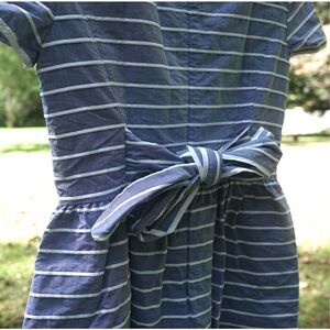 - “This crisp cotton dress is the epitome of effortless summer style. Cast in classic stripes, this dress features a round neckline, short sleeves, a tie detail at the waist, a gathered waist, on-seam side pockets and a concealed back zip closure. Fully lined in pure cotton.”