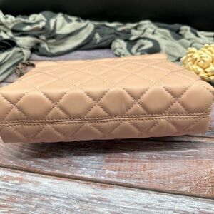This Badgley Mischka crossbody bag showcases a luxurious soft vegan leather quilted design in a chic pinky beige color. Its structured silhouette is highlighted by contrasting black gunmetal hardware, adding a touch of elegance to your ensemble. Turn lock. Comfort shoulder strap. One zippered pocket inside and one open pocket inside. Authentic. New with tag! Measures 5.5x8”