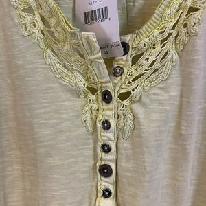 This stylish women's top features a delicate lace trim and a vibrant yellow color, perfect for adding a pop of color to your wardrobe. Key lime 🍋🟩
