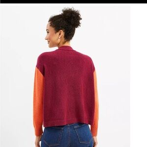 Stylish LOFT cardigan with a colorblock design. Features cream, burgundy, and orange panels. Perfect for layering.