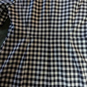 This black and ivory sheath dress features a classic gingham check pattern and a crew neck design. With short sleeves and a fitted bodice, it offers a tailored look perfect for casual or work occasions.
