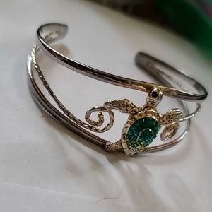 Silver-Tone bracelet Green & Clear crystal Rhinestone shell. Sea Turtle. Open back cuff style.