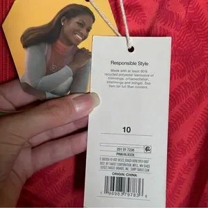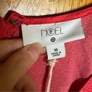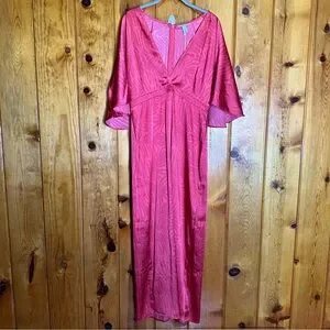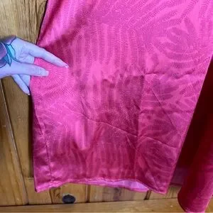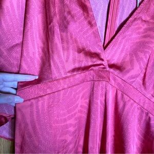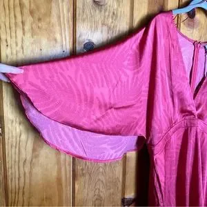 Exaggerated flutter sleeve. Maxi length. All over palm leaf contrast print. Zip up back closure. Deep v-neckline. Tag says pink but more red in my personal opinion.