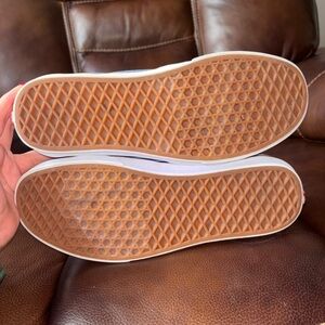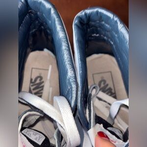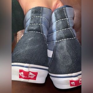 Vans Sk8-Hi Navy / Blue / Black Vans high top skate suede with white accent stripe, Slight discoloration on the rear and sides.