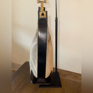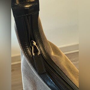 Capture a timeless, vintage look with this elegant Gucci Canvas Hobo Bag featuring black leather accents. This rare find is a perfect addition to any designer collection, offering both classic style and functionality.