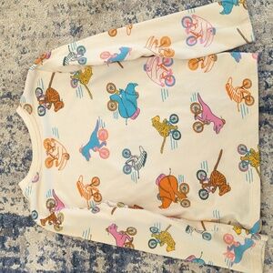 Cute and soft longsleeve animal themed shirt riding bikes. Size 5T, worn condition, shows some piling.