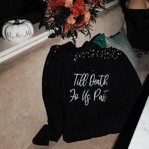 Black Denim jacket with pearl details. Back says 'til death do us part.' Purchased for Autumn wedding but it ended up being hot and it was never worn.