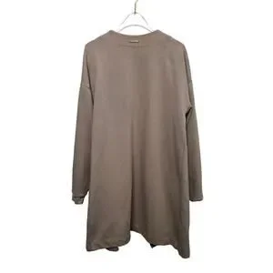 Pre-owned Gymshark cardigan in good/fair condition. Signs of wear include some discoloration at the back of neckline, and a very small spot on the left side (pictured, but would need to zoom in very close to see-not very noticeable.) The rest of the garment looks good. Belt is NOT included. Shown styled with one in one photo only for inspo. Color is light tan/dark beige, long sleeves, open-front, logo embroidered on upper left. 58% Cotton blended with Polyester. Measurements when flat: