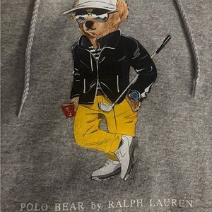 Cozy gray hoodie featuring a stylish Polo Bear graphic. Perfect for casual wear. Smoke free home. No tag on it but I am an XL and it fits me perfectly.