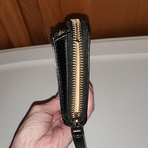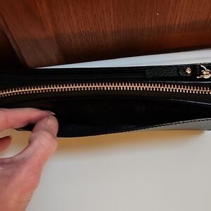 Elegant black wristlet by Kate Spade. Features a sleek design. Perfect for any occasion. New without tags. Corner zip. Gold hardware. Measures 8L x 4.5H. 2 outside pockets, one of which is a zipper pocket. Inside has many pockets and card slots. Pebble leather.