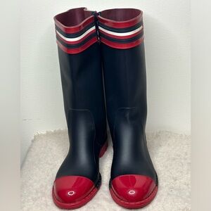 Striped red and white color, the Talisa rain boots from Tommy Hilfiger complete weather-ready style with fashion.