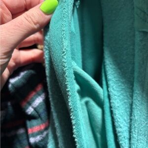 Worn twice, fits oversized. Mixture of fleece and knit type of material. Last picture is to show the distressing on the knit—this is how it came.