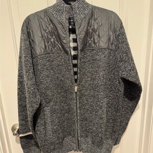 Stylish gray sweater jacket with quilted design. Features a full zip front. Perfect for layering. Grey with touches of black. Mens Gioberti Size large. Good condition.
