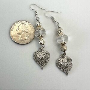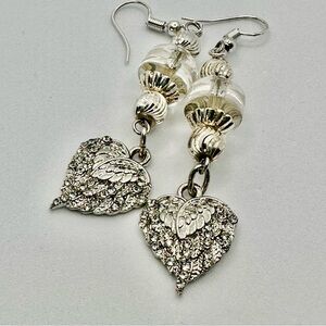New Handmade Earrings - Elegant silver dangle earrings featuring heart shaped feathers with sparkling rhinestones. Clear glass beads and silver-tone accents will complement any outfit.