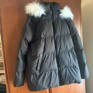 A black lightweight warm puffer jacket with faux fur lined hood that is removable with a hidden zipper. The jacket has zipper and two pockets with clips. New. Size M